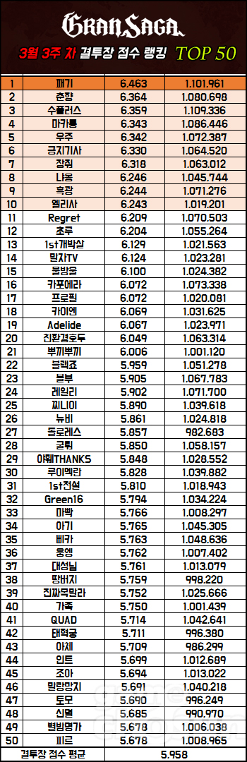 랭커들의 결투장 평균 점수는 지난 랭킹 대비 87점 하락한 5,958점이다. 결투장 연관 이벤트인 '벨 교수의 연구 자료를 찾아라'가 종료된 후 최상위권뿐만 아니라 전체적으로 고르게 점수가 하락했다. 별도의 결투장 연관 이벤트가 없을 경우 현 상황을 유지할 것으로 예상된다.