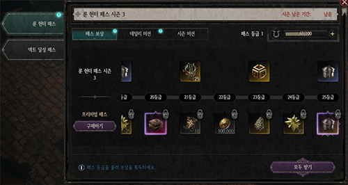 한편, 업데이트와 함께 룬 헌터 패스 시즌 3도 열린다. 패스 보상은 최대 25등급까지 있으며 등급별로 1회 획득할 수 있다. 일반 보상에 더해 프리미엄 패스가 존재하며, 프리미엄 패스 최종 등급에서는 시즌 특별 보상으로 룬 희귀 상승 에센스 꾸러미(희귀)를 얻을 수 있다.