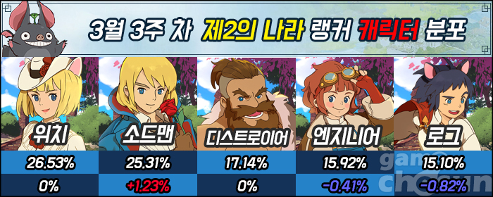 위치가 부동의 1위를 유지하고 있는 가운데 소드맨이 지난 랭킹에서 잃었던 지분을 그대로 되찾으며 25.31%로 복귀했다. 여전히 3위 이하 직업들과 격차가 크기 때문에 금발 남매의 상위권 독식은 계속될 예정이다.