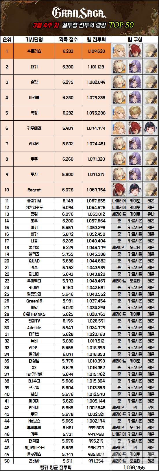 랭커 평균 전투력은 지난 랭킹 대비 1,111 상승한 1,036,755를 기록했다. 랭커들의 성장은 사실상 정지 상태에 가까우며, 차기 업데이트가 진행되기 전까지 현상 유지가 계속될 것이 확실시되고 있다.