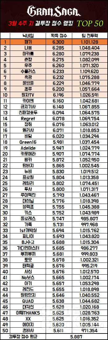 랭커들의 평균 획득 점수는 71점 하락한 5,887점이다. 큰 이벤트가 없는 결투장 비수기와 비교하면 평균 수준이며, 결투장 관련 업데이트나 이벤트가 시작되면 다시 6천 점 대로 회복할 것으로 보인다.