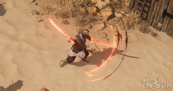 기를 터트린 후, 도신이 빨갛게 변한 후 빠르게 전방을 향후 연속해서 베기를 하는 패턴이다. 발동 후에는 방향을 바꾸지 않기 때문에 모리스가 바라보는 방향에서 벗어난다면 쉽게 피할 수 있다. 다만, 실수로 맞게 되면 경직때문에 2~3타 이상을 맞게 되는데 피해량이 상당한 편이다. 특히, 모리스의 생명력이 50% 이하일 경우 위력 자체도 강해져 순식간에 사망할 수 있으므로 주의가 필요하다.