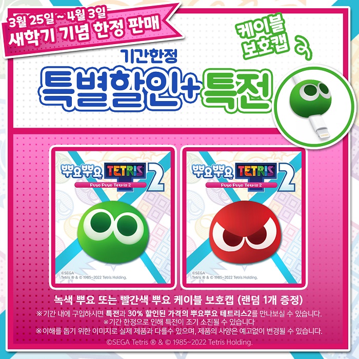 [자료제공 = 세가퍼블리싱코리아] 세가퍼블리싱코리아(대표 사이토 고)는 PlayStation®4, PlayStation®5와 Nintendo Switch™ 타이틀로 절찬 판매 중인 『뿌요뿌요™테트리스®2』를 새학기 기념으로 내일 3월 25일(금)부터 4월 3일(일)까지 기간 한정(10일간)으로 30% 특별할인 판매 실시와 녹색 뿌요 또는 빨간색 뿌요의 케이블 보호캡 중 하나를 랜덤으로 증정한다고 밝혔다.