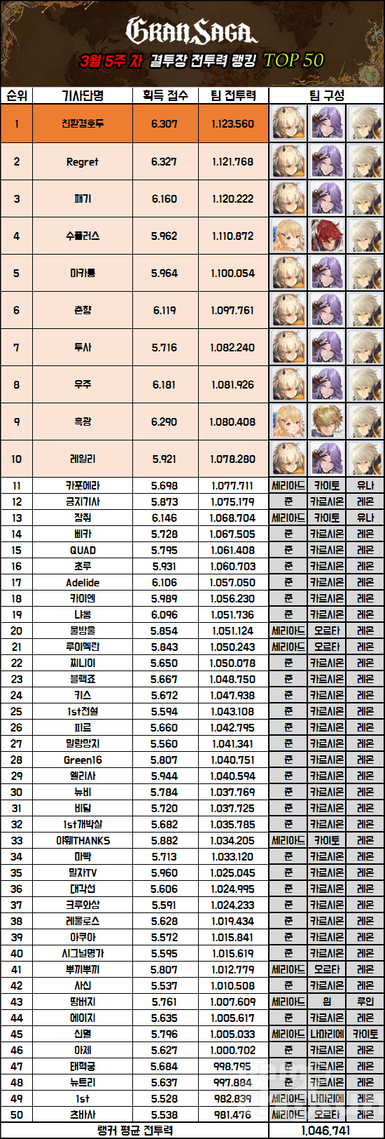 친환경호두도 최근 1위를 장기간 유지했던 수플러스와 패기를 넘어 새로운 1위에 등극했다. 달성 전투력은 1,123,560으로 2위 Regret과 1,792점 차이다. 그 뒤를 이어 최근 오랫동안 1위를 기록했던 패기, 직전 랭킹까지 3주 연속 전투력 1위 기록을 쓰고 있었던 '수플러스'가 쫓고 있다.