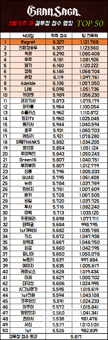 Regret이 점수 랭킹 1위를 차지했다. 서버 통합 이전 에스프로젠 서버에서 활동했을 때도 결투장 랭킹 상위권을 오르내렸던 유저인 만큼 1위 잠재력이 충분했던 유저다. 획득 점수는 6,327점. 불과 20점 차이로 아슬아슬하게 2위 친환경호두를 넘어 1위를 달성했다.