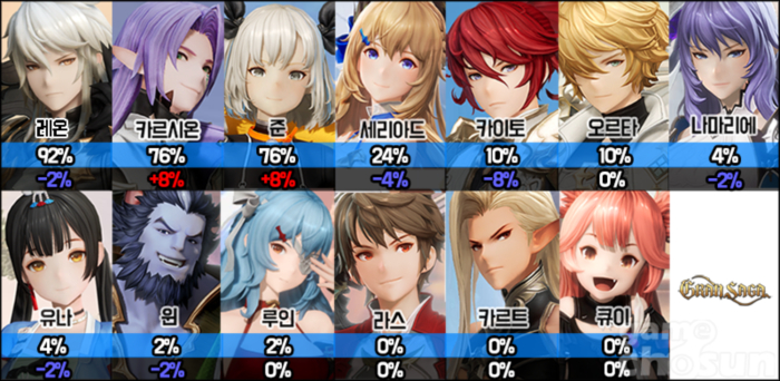 오랫동안 큰 변화가 없었던 캐릭터 선택률에 괄목할 만한 변화가 생겼다. 바로 최상위 캐릭터로 손꼽히는 카르시온과 준의 선택률이 나란히 70%를 넘긴 것이다. 두 캐릭터의 선택률은 한때 50%까지 하락했었으나 카이토와 유나의 선택률이 점점 하락하면서 무난히 선택률 76%를 달성했다. 전성기 카이토, 유나, 세리아드 조합조차 보여주지 못한 선택률을 달성하며 레온, 카르시온, 준 파티는 확고부동 1티어 파티가 되었다.