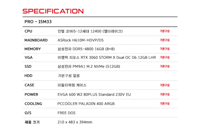 인텔 12세대 12400 엘더레이크 기반으로 제작된 PC로 게이머들이 가장 선호하는 지포스 RTX 3060 부품이 장착되었으며, 차세대 규격인 DDR5 메모리와 PCIe 4.0x4 M.2 NVMe를 적용하면서 인텔 12세대를 이용해 만드는 PC 특징을 잘 살린 제품으로 보인다.