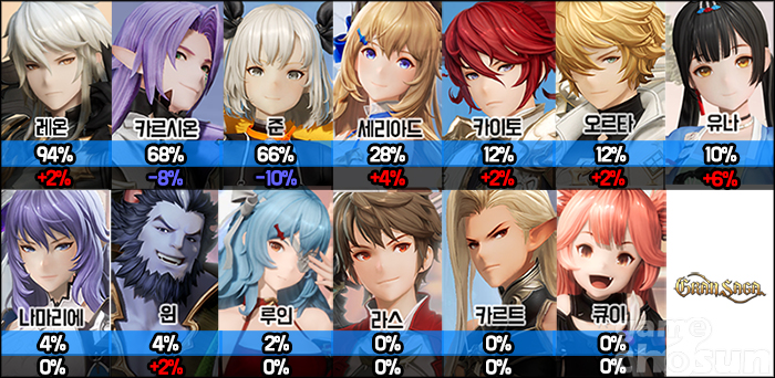 하위권은 큰 변화가 없었다. 나마리에와 윈이 4%, 루인이 2%지만, 사실상 쓰는 사람만 쓰는 수치다. 라스와 카르트, 큐이는 메타에 어울리지 않은 구성 덕분에 여전히 0%에서 벗어나질 못하고 있다.