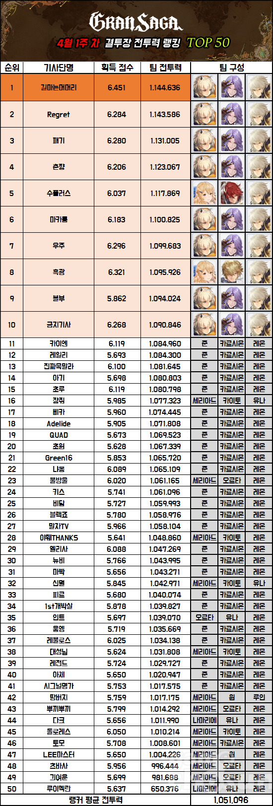 ■ 전투력 랭킹 1위 역시 '길마는머머리', 상위권 레온, 카르시온, 준 파티 평정