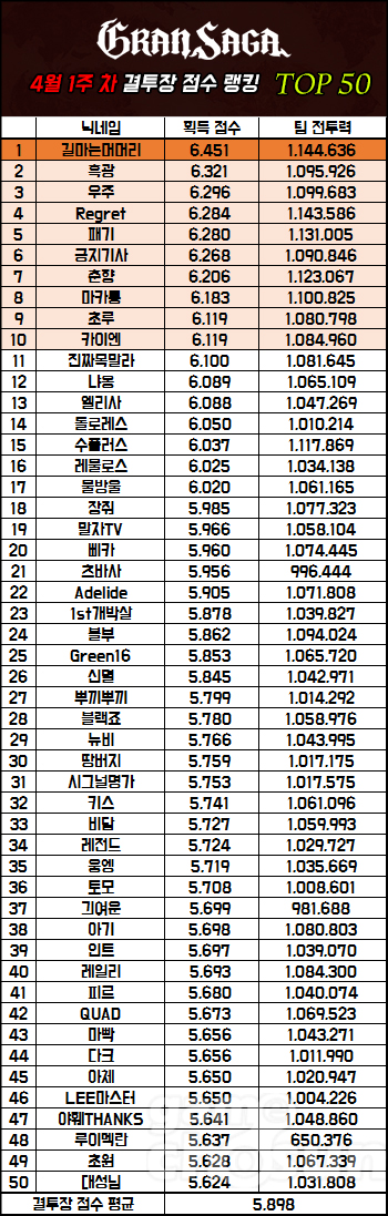랭커들의 평균 전투력은 지난 랭킹 대비 81점 상승한 5,898점을 기록했다. 지난 랭킹은 6천 점을 넘긴 랭커가 9명에 그쳤지만, 이번 랭킹에선 무려 17명이 6천 점을 넘기며 평균 전투력 상승을 견인했다.