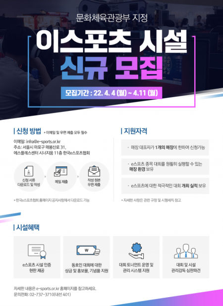 지난 2020년에 시작한 ‘이스포츠 시설 지정사업’은 지역의 이스포츠 문화 활성화 및 기초 경기시설 확보를 위해 문화체육관광부가 이스포츠(전자스포츠) 진흥에 관한 법률에 따라, 이스포츠 문화를 선도할 수 있는 인터넷컴퓨터게임시설제공업(이하 PC방)을 이스포츠 시설로 지정하고 지원하는 사업이다. 이스포츠 시설로 지정되면 지역 이스포츠 문화 활성화에 기초가 되는 생활 스포츠 시설의 역할을 수행하며, 이에 따라 시설 홍보와 아마추어 대회 개최 지원 등이 제공된다.
