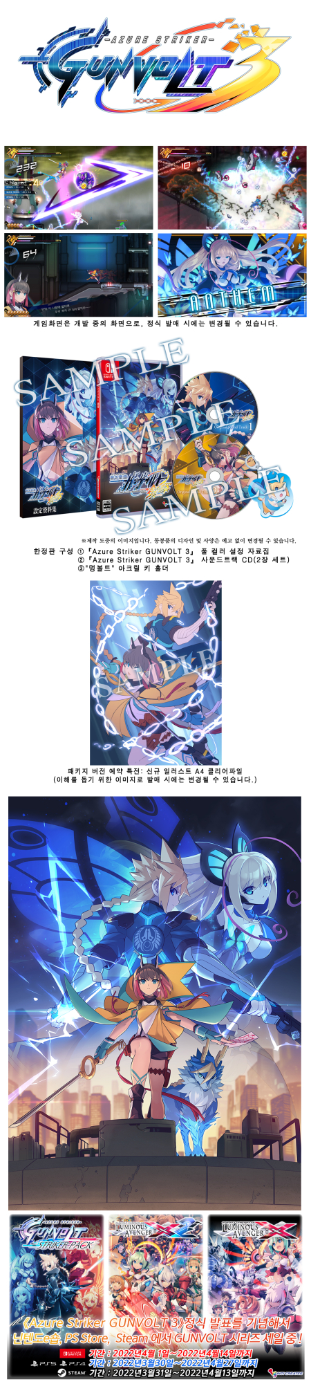 인티 크리에이츠의 Nintendo Switch™용 라이트 노벨 2D 액션게임 「Azure Striker GUNVOLT 3」는 2022년 7월 28일(목)에 발매 예정이며, 패키지 버전과 다운로드 버전이 함께 발매된다.