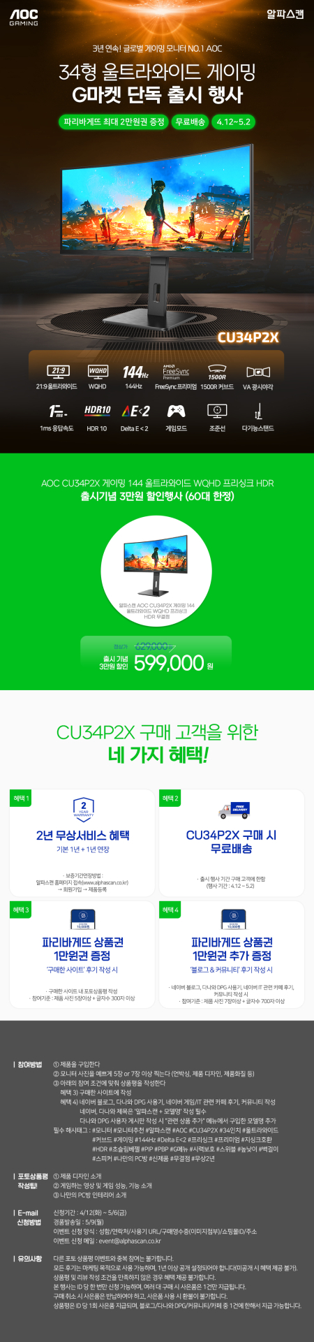 4월 12일부터 5월 2일까지 ‘G마켓’에서 단독으로 진행되는 CU34P2X 출시기념 행사에서는 60대 한정 3만원 할인과 무료배송 및 2년 무상서비스 혜택을 제공한다. 구매 사이트에 포토상품평을 작성하면 파리바게트 상품권 1만원을 증정하고, 네이버 블로그나 다나와 DPG, IT관련 커뮤니티 및 카페에 포토상품평을 올리면 파리바게트 상품권 1만원을 추가 증정한다.