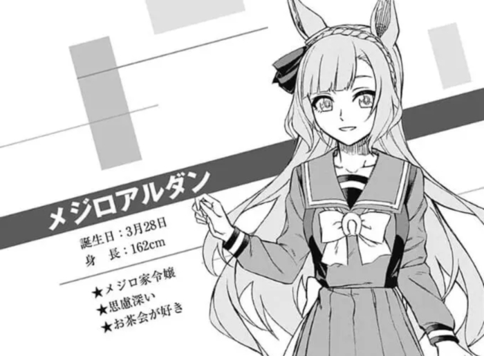 메지로 아르당은 특이하게도 우마무스메 만화 '우마무스메 신데렐라 그레이'에 먼저 출연한 캐릭터다. 주인공인 오구리 캡이 중앙 트레센 학원으로 전학 왔을 때 반 친구로 등장하며, 그녀의 실력을 한 눈에 간파하는 실력자로 등장한다. 게임에선 메인 스토리에 등장하지 않지만, 개인 스토리를 통해 메지로 일가의 일원으로 약한 몸을 극복해 노력하는 캐릭터로 등장한다. 게임 메인 스토리와 애니메이션에 등장하지 않는 대신 개인 스토리와 육성 스토리의 완성도가 높아 큰 화제가 됐던 캐릭터다.