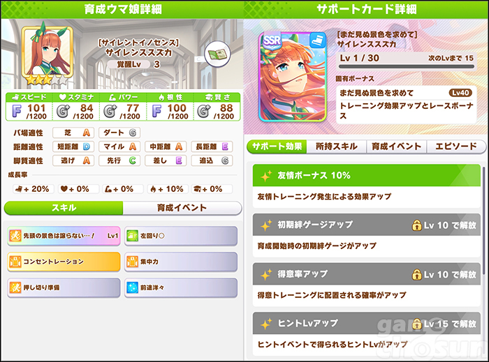 그래서 사일런스 스즈카는 게임에서도 마일/중거리 특기의 도주마로 등장한다. 고유 스킬 '선두의 경치는 양보하지 않아...!'부터 도주에 특화된 효과이며, 자체 스킬로 스타트에 도움을 주는 '컨센트레이션', 도주에 유리한 '빠른 걸음'과 '도망자', '대도주'를 얻을 수 있다.