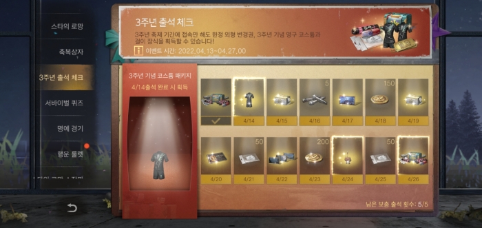 다음은 3주년 기념 축제에 걸맞은 풍성한 보상으로 등장한 출석 체크 이벤트이다. 접속만 해도 마음대로 캐릭터의 커스터마이징을 변화할 수 있는 외형 변경권, 3주년 한정 코스튬은 물론 걸이 장식, 타이틀 그리고 종말 생존에 꼭 필요한 보급 패키지까지 모두 무료로 획득할 수 있다.