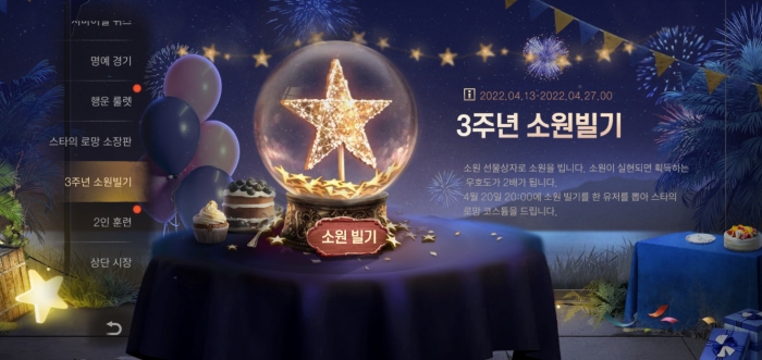 3주년 소원 빌기는 유저가 원하는 소원을 빌면 4월 20일 소원 빌기를 진행한 유저를 뽑아 3주년 기념 한정 코스튬 ‘스타의 로망’을 획득할 수 있다. 이처럼 라이프애프터 3주년 기념 이벤트는 참여만 해도 무료로 획득할 수 있는 풍성한 한정 보상과 인게임 아이템을 준비하였다. 이 외에도 종말 생존 상식을 도전하는 서바이벌 퀴즈와 경마, 눈사람 만들기, 잠수를 시합하는 명예 경기등 이벤트가 업데이트되어 다양한 재미를 줄 것으로 예상된다.