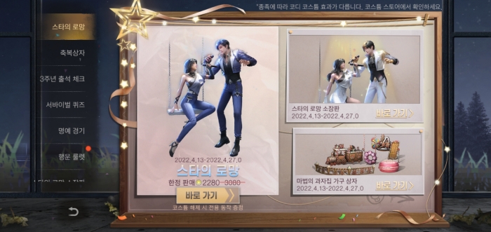 라이프애프터는 3주년을 기념하여 특별 코스튬, 축복 상자, 출석 체크, 소원빌기 등 다양한 이벤트를 3주년 축제 테마로 업데이트했다. 먼저 3주년 기념 코스튬 ‘스타의 로망’은 특별한 기념일을 맞이하여 ‘스타의 로망’ 소장판과 함께 등장하였다. 구매 시 한정 특가 혜택과 전용 동작을 획득할 수 있다.