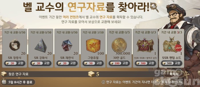 벨 교수의 연구 자료를 찾아라는 각종 콘텐츠를 이용해 얻을 수 있는 연구 자료를 통해 특정 보상과 교환하는 이벤트다. 주요 보상은 대미지 20% 증가 효과와 가디언 '바하무트' 해금에 필요한 '팬텀 소드' 극초월 재료, SSR 이상 방어구 상자와 각종 재화다. 과금 유저라면 바하무트 해금뿐만 아니라 이벤트 업적과 연계해 시바 해금에도 필요한 이벤트인 만큼 연구 자료를 최소 1,500개 모아 팬텀 소드를 세 번 교환해야 하며, 무과금 유저라면 부담없이 재화와 교환하면 된다.