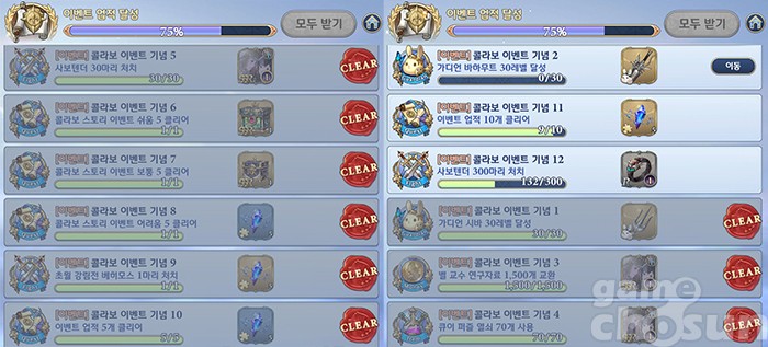 게임을 시작하면 가장 먼저 콜라보 기념 연속 출석 이벤트 페이지가 뜬다. 이벤트로 얻을 수 있는 아이템은 콜라보 가디언 '타이탄' 획득에 필요한 '혼돈의 아니마'부터 골드, 왕국 명령서, 그랑 쥬얼 등을 얻을 수 있다. 즉, 하루라도 접속을 한다면 적어도 콜라보 가디언 하나는 얻을 수 있는 것이다. 다만, 15일부터 이벤트를 시작했다면 아쉽게도 라스의 콜라보 한정 코스튬은 얻을 수 없다.