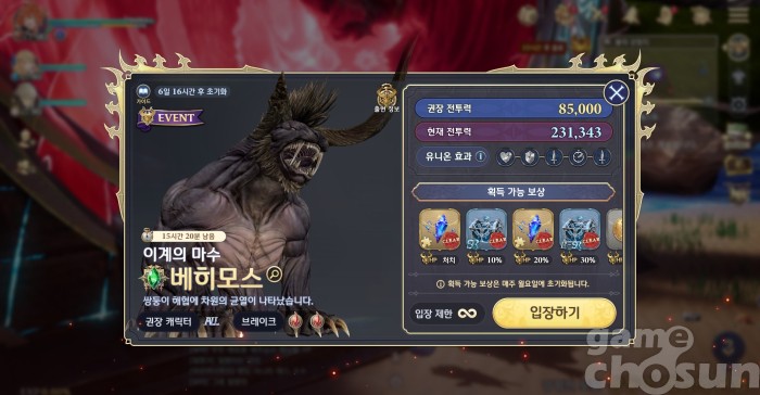 이벤트 스토리 보상을 챙겼다면 이벤트 강림전 '베히모스'를 도전하자. 베히모스는 넉백, 에어, 다운 세 가지 상태 이상을 사용하지만, 행동 불가 시간이 길지 않고 권장 전투력도 낮아 혼자 클리어 가능한 수준이다. 보상은 일주일에 한 번, 월요일에 초기화 되니 앞으로 두 번밖에 받지 못하지만, 각종 티켓과 SSR 키스톤 파편 조각, 악세사리 등 유용한 아이템을 얻을 수 있다.