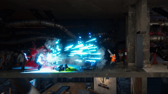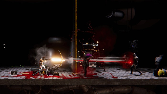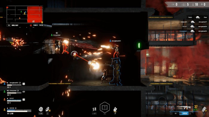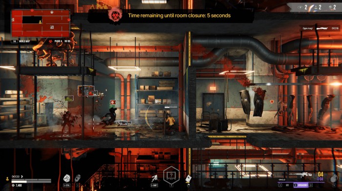 그렇다면 어떤 형태로 게임이 진행될까? 배틀로얄 게임임에 따라 플레이어는 최후의 생존자 혹은 팀이 되는 것을 목표로 다른 플레이어와 경쟁하게 된다. 앞서 언급한 바와 같이 사이드뷰로 진행되기에 맵은 다양한 층과 방(룸)으로 이뤄져 있으며, 일정 시간마다 페이즈가 진행되면서 특정 방이 독가스에 의해 차단된다. 즉 독가스에 의해서 플레이어의 활동 범위를 조여온다.