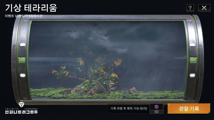 가장 먼저, ‘DIY 테라리움’ 이벤트는 밀폐된 소형 생태계 ‘테라리움’을 관측하고 관리하는 형태로 진행된다. 이용자는 생태계 관련 지식을 학습한 후, 테스트에 통과하면 인근 생태계 애호가들로부터 DIY 테라리움의 재료를 받을 수 있다. 이 테라리움을 통해 이용자는 생태계 학회가 제공한 참조 데이터를 엄격하게 준수하여, 환경 온도와 빛을 제어하는 등 생태학의 신비함과 매력을 느낄 수 있다. 또한, 이벤트 기간 동안 매일 1회 ‘관측기록’을 클릭하여 이벤트 보상도 획득할 수 있다.
