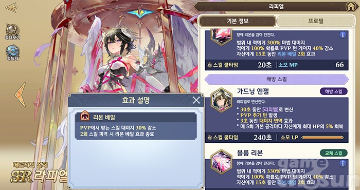 일단 라피엘의 스킬 구성과 극초월 옵션을 살펴보자. 일반 스킬 '플라워 리본'과 변신 후 교체 스킬 '블룸 리본'은 범위 내 적에게 마법 대미지를 입히고, 100% 확률로 PVP 턴 게이지를 감소시키며, PVP에서 받는 스킬 대미지를 감소시키는 '리본 베일' 효과를 2회 부여한다. 루인의 생존력을 크게 끌어올려 줄 수 있을 뿐만 아니라 PVP에서 가장 중요한 턴 게이지까지 줄여 루인의 가치를 크게 높였다.
