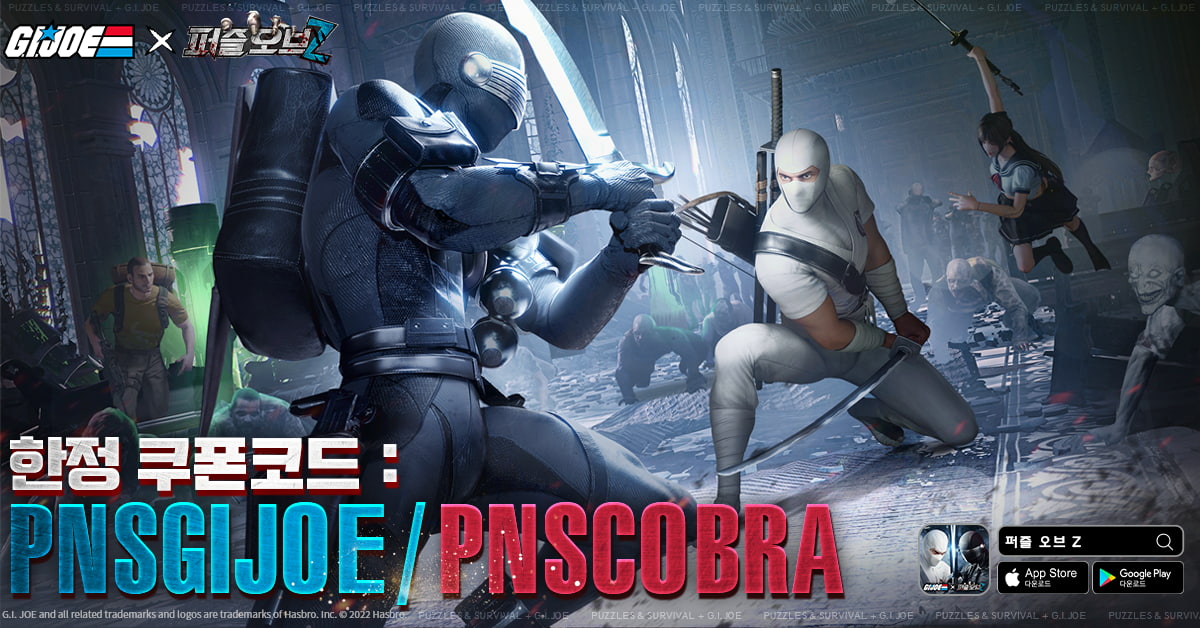 '지.아이.조'와 '퍼즐 오브 Z'의 콜라보레이션이 절찬리 진행되고 있다! 정의와 사악함이 맞붙는 전혀 새로운 역대급 대결, 준비되셨습니까? 이번 콜라보레이션을 위해 두 개의 쿠폰코드 “PNSGIJOE” “PNSCOBRA”가 특별히 준비되어 있다고 하니 전투에 나서기 전에 미리 충분한 자원을 확보해 두자! 더 신나고 더 재미있는 이벤트와 게임 관련 정보는 공식 카페를 통해 확인할 수 있다.