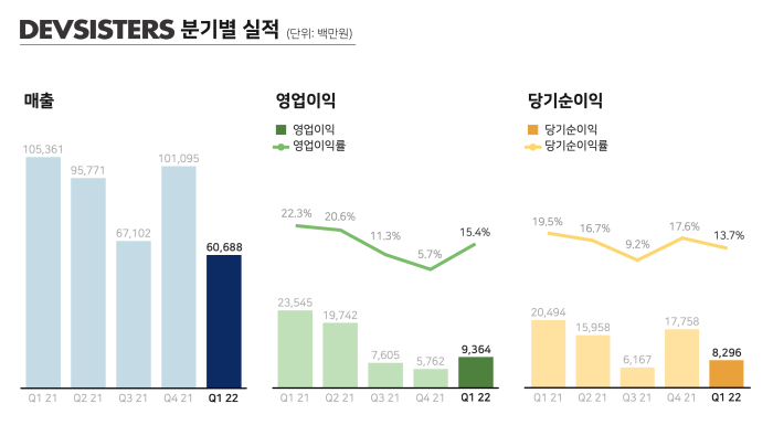 [자료제공 = 데브시스터즈] 데브시스터즈(공동대표 이지훈, 김종흔)가 K-IFRS 연결 기준 2022년 1분기 실적을 11일 발표했다.