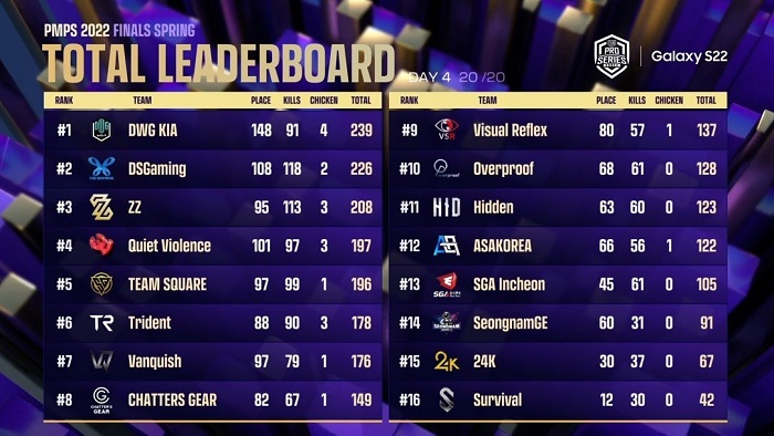 PMPS 2022 시즌1과 시즌 2에 참가했던 16개팀이 동일하게 출전해 하루 5매치씩 총 20매치에서 치열하게 승부를 겨룬 끝에 DWG KIA(담원 기아)가 총 4치킨, 239포인트를 달성하고 PMPS 2022 파이널 스프링의 최종 우승을 차지했다.