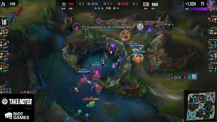 특히, 18분 경 드래곤 앞에서 벌어진 한타에서 RNG 한가운데로 텔레포트한 T1의 그웬이 적진을 휘저으며 RNG를 격퇴한 끝에 큰 이득을 만들어냈다. 이후 3라인 전체를 압박한 T1은 바론 앞에서 RNG를 끌어들여 한타를 벌였다. 난전 속에서 바론을 처치한 T1은 순식간에 RNG를 격파하고 미드 라인을 통해 넥서스까지 밀어내며 지난 경기의 설욕을 되갚았다.