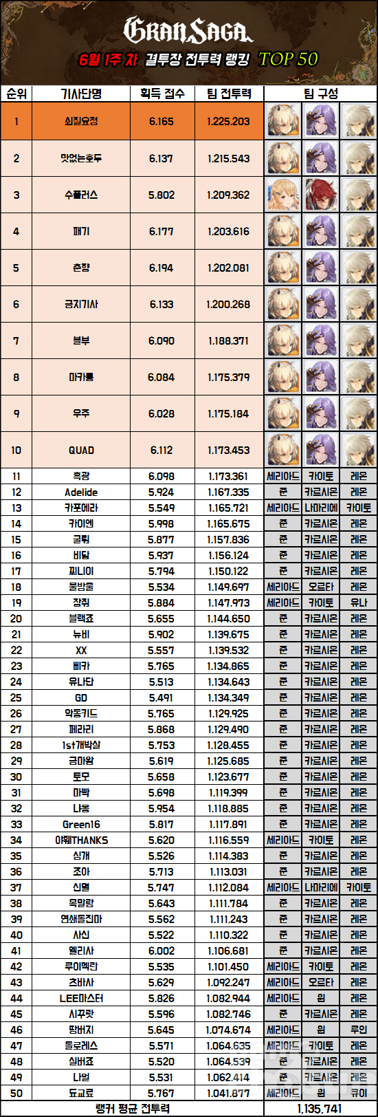 그랑사가의 결투장 69주 차 랭킹, 점수 1위는 '춘향', 전투력 1위는 '쇠질요정'이 차지했다.
