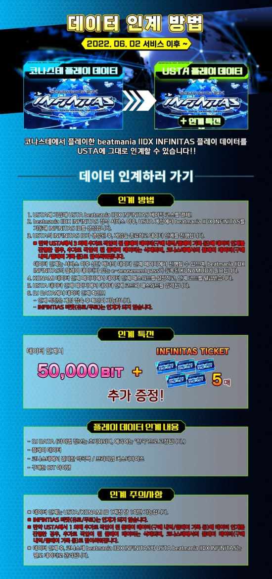 기존 일본판 인피니타스를 플레이하던 유저들은 1계정당 1회에 한정하여, 일본판 인피니타스 데이터를 가져오는 것이 가능하다. 다만, 데이터 인계시, 기존의 데이터가 삭제되고 일본판 데이터만 남게 되므로, 악곡팩 등의 아이템을 구매하려는 유저는, 반드시 데이터 인계 후에 진행해야 한다.