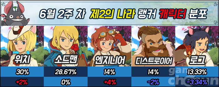 위치 랭커가 최상위 랭커 비율의 30%를 넘기면서 랭커 캐릭터 점유율 1위를 탈환했다. 지난 랭킹까지 꾸준히 1위를 지켜내던 소드맨은 이번 랭킹에서 변화가 없었기 때문에 높은 점유율에도 2위에 머물렀다.