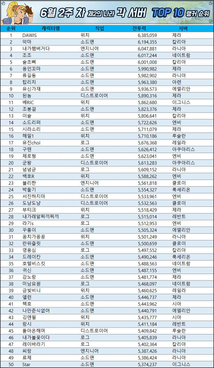 이 밖에도 라니아 서버 '내가햄버거다', 네이트람 서버 '조조', 칼리아 서버 '술초삐' 등 총 세 명의 랭커가 전투력 600만의 문턱을 넘었다. 9위인 에델리안 서버 '유신가재'까지 전투력 590만을 넘기는 모습을 보여주면서 최상위 랭커들은 전투력 600만 시대에 돌입했다.