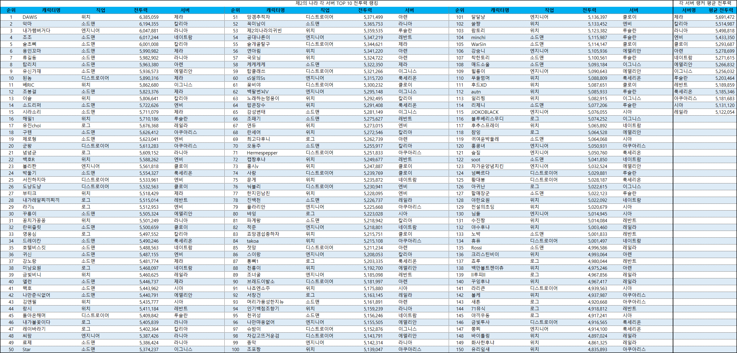 이번 랭킹에서도 평균 전투력 1위는 제라 서버, 2위는 칼리아 서버가 가져갔다. 다만 3위는 라니아 서버, 4위는 엔비 서버가 되면서 지난 랭킹과 뒤바뀐 모습을 보여줬으며, 5위였던 아렌 서버는 이번 주 클로이 서버에게 자리를 내주었다.