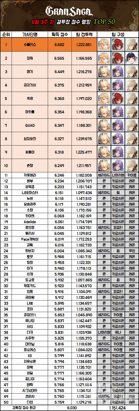 그랑사가의 결투장 71주 차 랭킹, 점수 1위는 '수플러스', 전투력 1위는 '쇠질요정'이 차지했다.