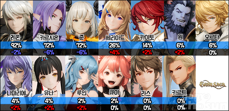 결투장 최고의 파티로 손꼽히는 '레온, 카르시온, 준'의 선택률이 소폭 하락했다. 대신 그 외 주류 캐릭터들의 선택률은 소폭 상승했는데 이는 랭커들의 조합이 바뀐 것보다 상승한 캐릭터를 사용하는 랭커들의 순위가 오른 것으로 봐야할 것이다.