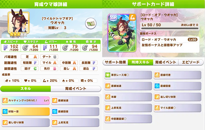 SSR 파워 서포트 카드인 '로드 오브 보드카'는 '직선 교자', '직선 가속', '직선 회복', '호전일식' 등 직선 관련 스킬이 많아 유저들에게 애용되는 카드였다. 마일과 중거리, 선입 스킬이 많긴 하지만 가속과 회복 스킬을 동시에 얻을 수 있어 범용 카드로 사용하기 좋다.