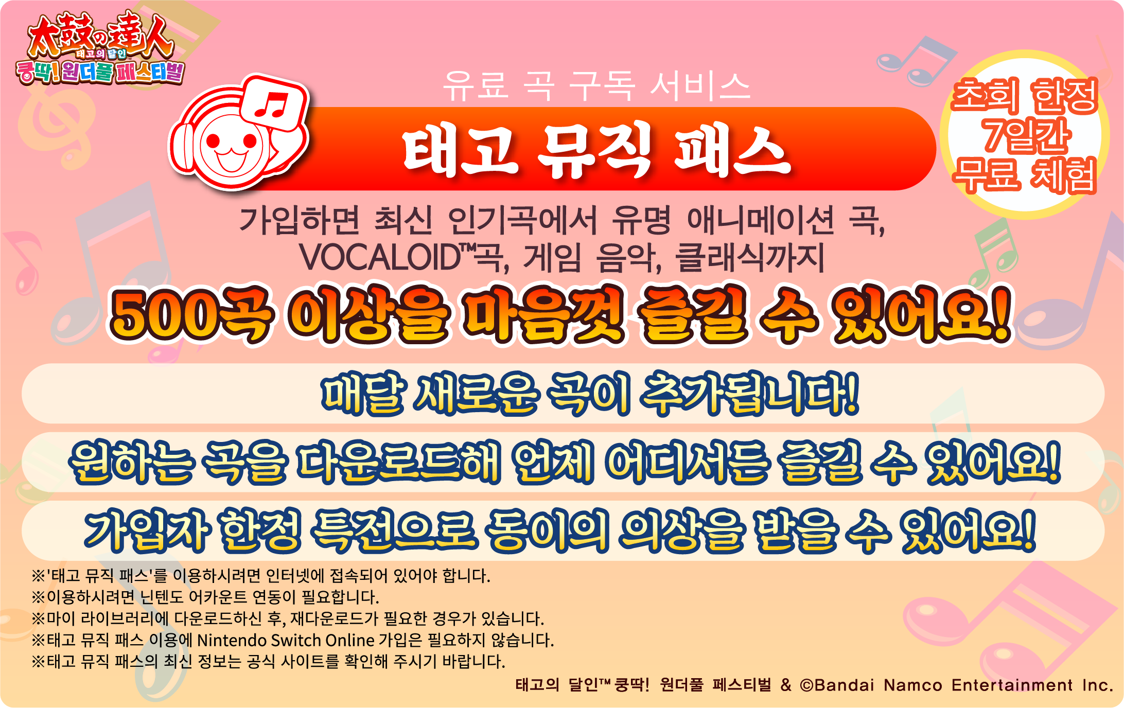 게다가, 500곡 이상을 마음껏 플레이할 수 있는 유료 곡 구독 서비스 '태고 뮤직 패스'도 등장하며, 혼자서도, 여럿이서도, 태고로 마음껏 즐길 수 있다.