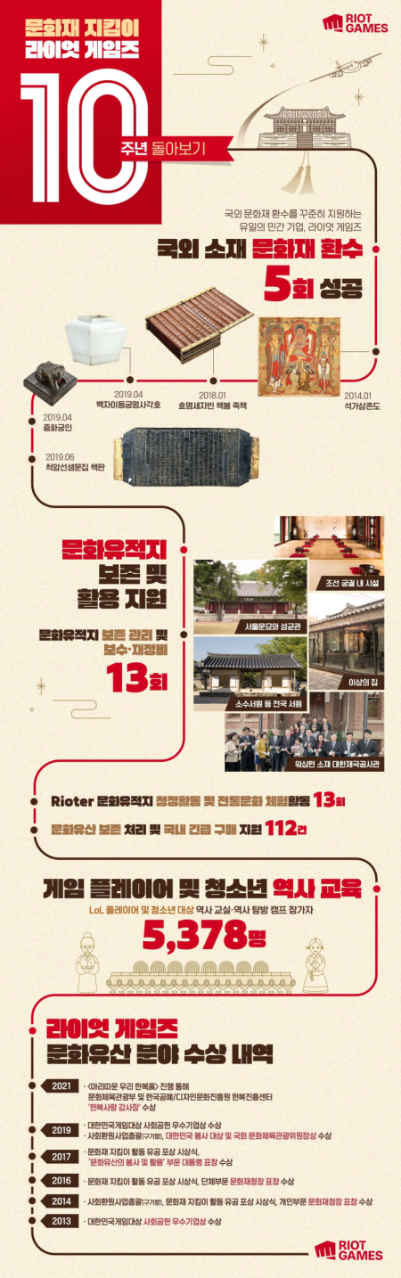 [자료제공 = 프레인] 라이엇 게임즈(한국대표 조혁진)가 27일 지난 10년 동안 꾸준히 진행해 온 자사 사회환원 프로젝트 <한국 문화유산 보호 및 지원> 사업의 주요 성과를 홈페이지 공지 내 인포그래픽(LINK)을 통해 공개했다.