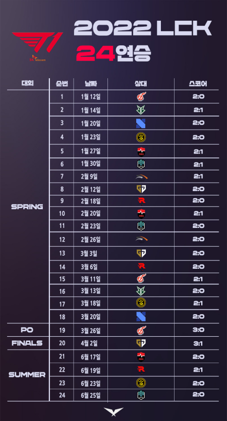 [자료제공 = 스포티즌] '리그 오브 레전드(LoL)' e스포츠의 한국 프로 리그를 주최하는 리그 오브 레전드 챔피언스 코리아(대표 오상헌, 이하 'LCK')는 22일부터 26일까지 서울 종로구 그랑서울 롤파크에 위치한 LCK 아레나에서 열린 2022 LCK 서머 2주차에서 T1이 리브 샌드박스와 담원 기아를 연파하면서 24연승을 달성했다고 밝혔다.