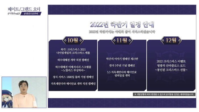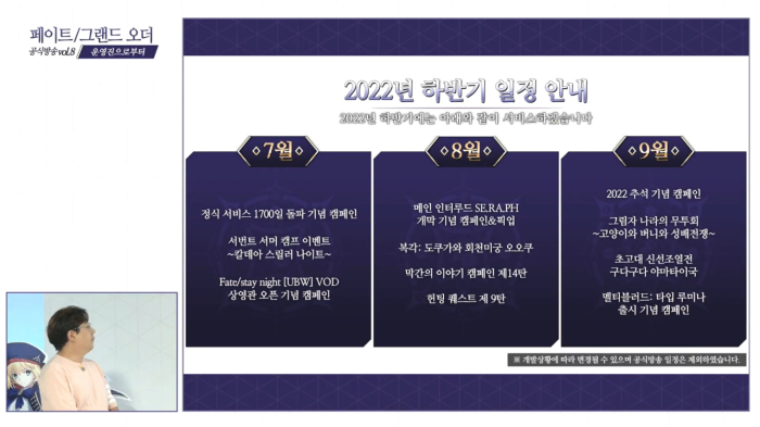 특별 게스트로 참석한 넷마블 한지훈 사업그룹장은 '페이트/그랜드 오더' 하반기 운영 계획을 발표했다. 7월 서번트 서머 캠프 이벤트를 시작으로 8월 메인 인터루드 개막 기념 캠페인, 9월 그림자 나라의 무투회, 10월 허수대해전, 11월 신규 메인 스토리 2부 5.5장 지옥계만다라 헤이안쿄 개막, 12월 크리스마스 이벤트를 준비중이라고 밝혔다.