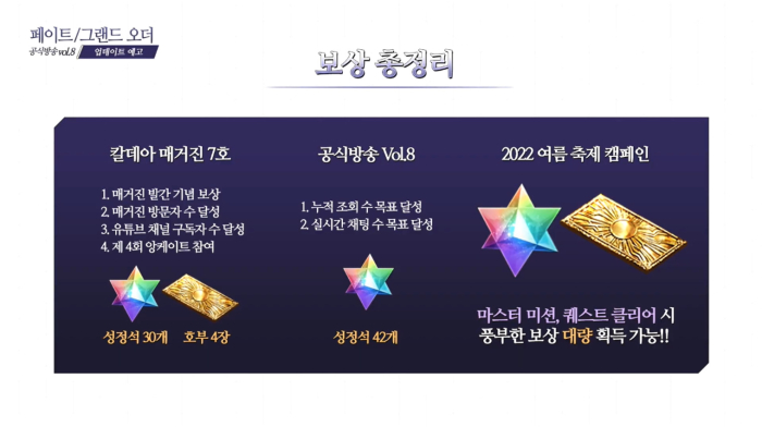 넷마블을 이번 방송을 통해 페이트/그랜드 오더 유저들에게 여러 보상을 지급할 예정이다. 방송 누적 조회수 7천 달성 시 성정석 12개, 실시간 채팅 수 3만 건 달성으로 성정석 30개, 이벤트 달성으로 총 90개를 7월 5일 23시 59분까지 지급한다. 또한 칼데아 매거진 7호 발간 기념으로 성정석 10개, 방문자 수 1만 명 달성 시 성정석 10개, 채널 구독자 5천 명 달성 시 성정석 10개, 제4회 앙케이트 참여 시 호부 4장을 보상으로 지급한다.