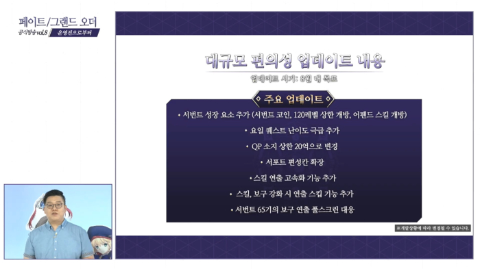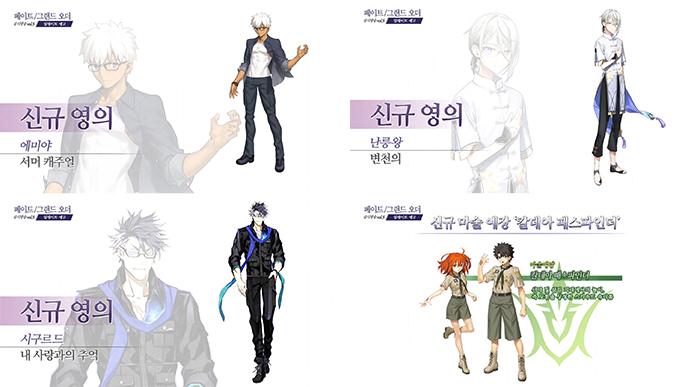 특히, 8월에는 대규모 편의 업데이트가 들어간다. 서번트 코인, 120레벨 상한 개방, 어펜드 스킬 개방 등 서번트 성장 요소가 추가되며, 요일 퀘스트에 난이도 ‘극급’이 추가된다. 또, 서번트 편성칸이 확장되고, 스킬 연출 고속화 등 각종 편의 기능이 들어가 이용자들이 좀더 편리하게 게임을 즐길 수 있을 예정이다. 이외에도 11월에는 '페이트/그랜드 오더' 5주년을 기념한 특별 캠페인이 진행될 예정이다.
