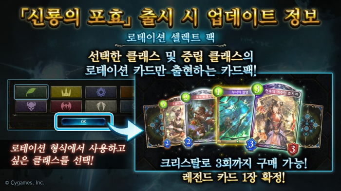 ‘로테이션 셀렉트 팩’은 선택한 클래스 및 중립 클래스의 로테이션 카드만 등장하는 카드팩으로, 크리스탈로 3회까지 구매할 수 있으며 레전드 카드가 확정 출현한다.