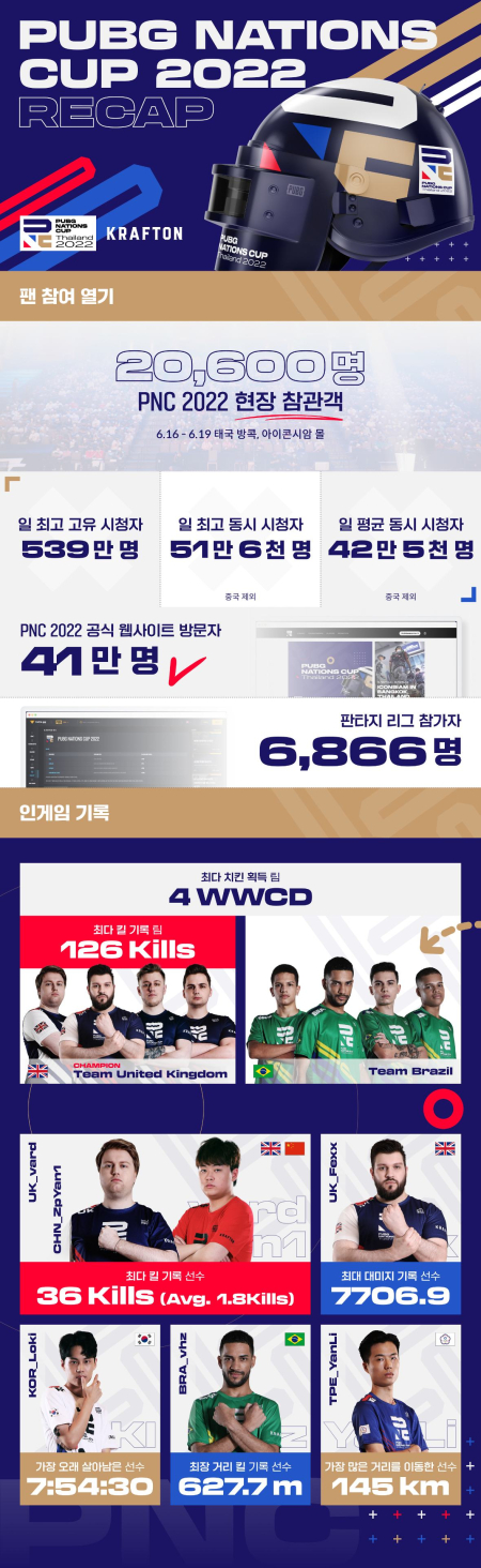 [자료제공 = 미디컴M] 크래프톤(대표 김창한)은 배틀그라운드 국가대항전인 ‘펍지 네이션스 컵 2022(PUBG Nations Cup, 이하 PNC 2022)’을 총결산하는 인포그래픽을 통해 온오프라인으로 진행된 행사의 주요 성과를 공개했다.