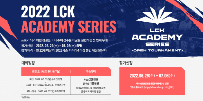 아울러 LCK 아카데미 시리즈 오픈토너먼트 5회차 참가신청이 오는 7월 6일(수)까지 진행된다. 참가자격은 만 12세 이상 2022시즌 다이아4 이상인 본인 계정을 소유한자로, 5명이 팀을 이뤄서 신청하면 된다. 최근 6개월 내에 LCK 및 타 지역 프로리그에 출전 이력이 있는 경우와 LCK 챌린저스 1개 시즌 5경기 초과 출전 이력을 보유한자는 규정상 참가가 제한되지만, ‘긴급 콜업’으로 인해 LCK 및 LCK 챌린저스 리그 로스터에 등록 및 출전한 자는 참가 제한 규정을 적용 받지 않는다.
