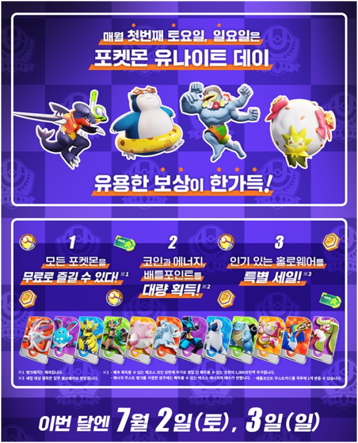7월의 '포켓몬 유나이트 데이'가 7월 2일(토)와 7월 3일(일)에 개최될 예정이다. 해당 주말 2일 동안은 5가지 캠페인이 진행될 예정이며, 자세한 사항은 '포켓몬 유나이트' 공식사이트에서 확인할 수 있다.
